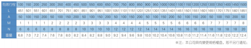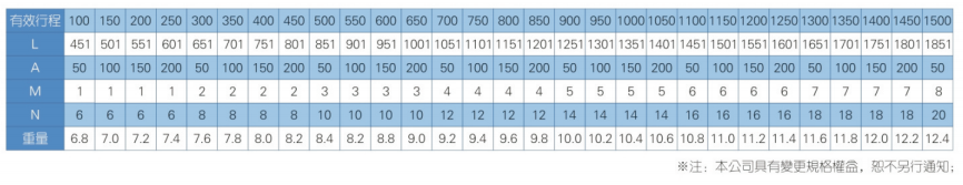 2、螺桿轉(zhuǎn)速超過臨界轉(zhuǎn)速時可能發(fā)生共振,臨界轉(zhuǎn)速和螺桿長度有關(guān),故滾珠螺桿的臨界轉(zhuǎn)速也間接決定了滑臺模組的有效行程和總長度,有效行程和常用螺桿規(guī)格轉(zhuǎn)速的關(guān)系如下列表格。