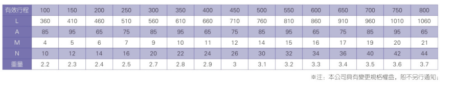 2、螺桿轉速超過臨界轉速時可能發生共振,臨界轉速和螺桿長度有關,故滾珠螺桿的臨界轉速也間接決定了滑臺模組的有效行程和總長度,有效行程和常用螺桿規格轉速的關系如下列表格。