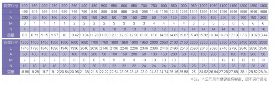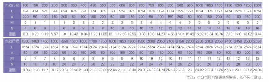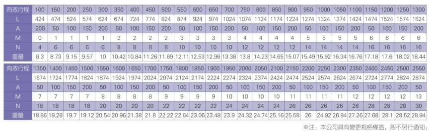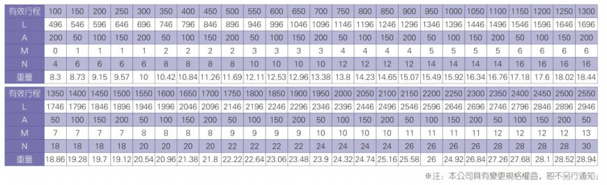 2、螺桿轉速超過臨界轉速時可能發生共振,臨界轉速和螺桿長度有關,故滾珠螺桿的臨界轉速也間接決定了滑臺模組的有效行程和總長度,有效行程和常用螺桿規格轉速的關系如下列表格。