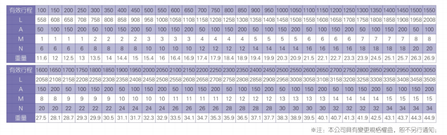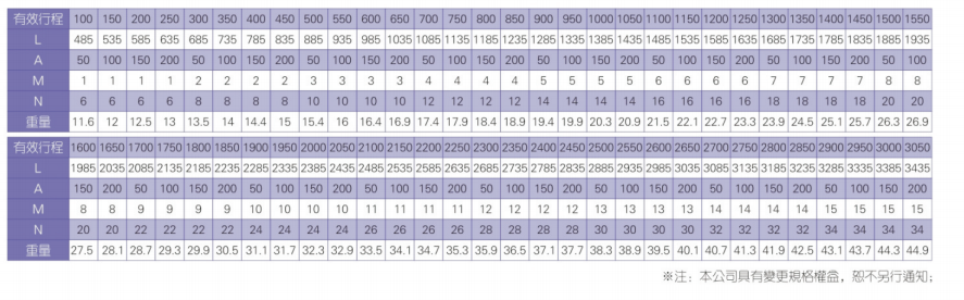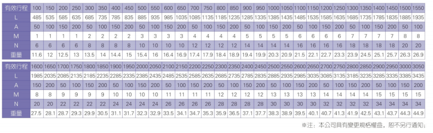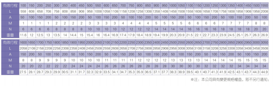 2、螺桿轉速超過臨界轉速時可能發生共振,臨界轉速和螺桿長度有關,故滾珠螺桿的臨界轉速也間接決定了滑臺模組的有效行程和總長度,有效行程和常用螺桿規格轉速的關系如下列表格。