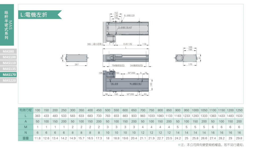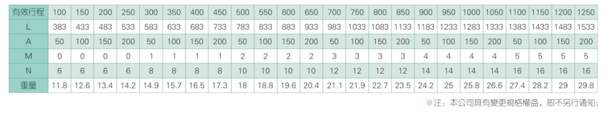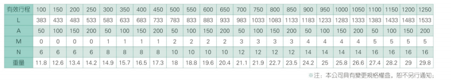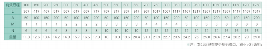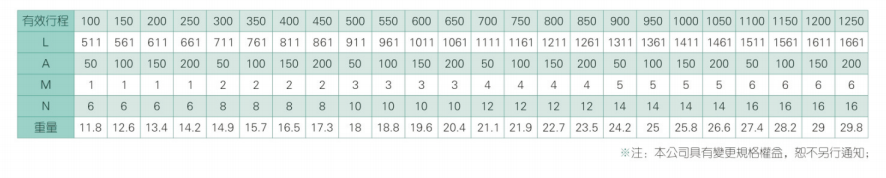 2、螺桿轉速超過臨界轉速時可能發生共振,臨界轉速和螺桿長度有關,故滾珠螺桿的臨界轉速也間接決定了滑臺模組的有效行程和總長度,有效行程和常用螺桿規格轉速的關系如下列表格。