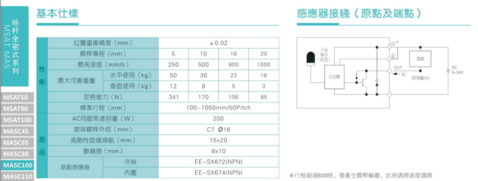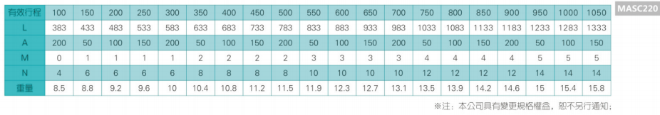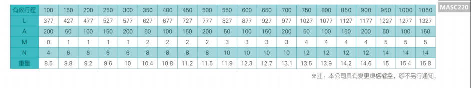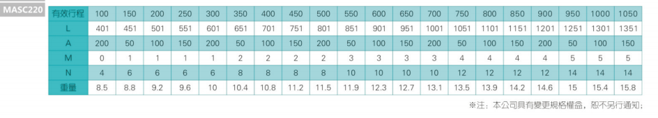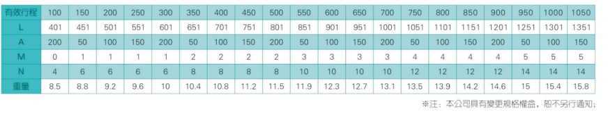 2、螺桿轉速超過臨界轉速時可能發生共振,臨界轉速和螺桿長度有關,故滾珠螺桿的臨界轉速也間接決定了滑臺模組的有效行程和總長度,有效行程和常用螺桿規格轉速的關系如下列表格。